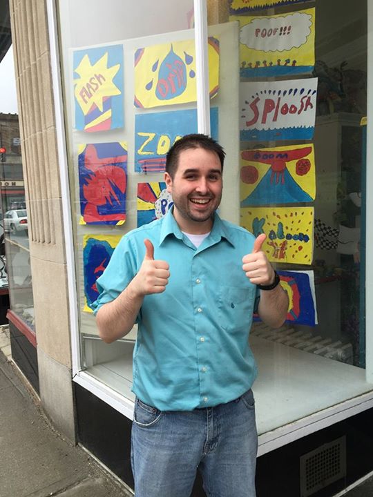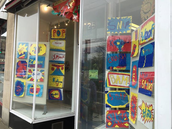 Mr. Preato’s 5th grade students from East School produced an exciting collection of artwork on display in the windows of Karen Rossi Studios at 27 East Main Street, Torrington, CT. The masterpieces are inspired by the Pop Art Movement, and display words that look like the sound. For instance “Splash” depicts drops exploding off the paper, and Zap is portrayed in a variety of manners, most alluding to en electrical arc. All the images are painted in primary colors with a vibrant effect.