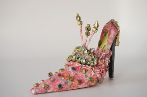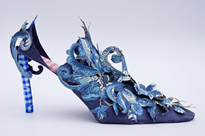 The Shoes are a transformation of everyday materials such as cardboard, brown paper, wallpaper, old maps and sheet music. Sometimes these are new and sometimes vintage; it depends upon the inspiration. Her work speaks to many themes: recycling, history, and nature with an eye to fashion and whimsy.