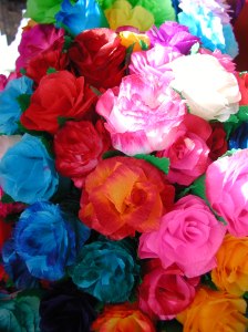 “After the Spanish conquest, paper brought from Spain became widely used, and in the 16th century the first paper mill in America was built in Culhuacan, a small town near Mexico City. A few decades later, a thin and colored paper called papel de China (paper from China) arrived with the Manila galleons and was soon used to make paper decorations like paper flowers and cut paper flags. Paper flowers were used to decorate the church in times of the year when natural flowers were not available. The art evolved as talented artisans made different types of flowers in a great variety of shades creating realistic, bright and colorful paper flowers.” Mexican Folk Art Guide