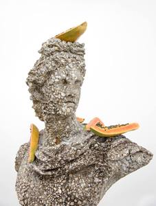Matelli singular, larger-than-life-size outdoor figurative sculpture will be on display through October 21, 2017. This work is an extension of Matelli’s Garden Sculptures series, initiated in 2015, in which he defaces garden statuary of classical or religious icons and subverts material expectation. Based on an ancient Greek statue of Hera and poised atop a pedestal, the statue, fabricated out of cast stone, is painstakingly aged to mimic a centuries old patina. An imposing nine-feet tall and sited on a three-foot tall pedestal, the neo-classical figure will be juxtaposed with flawlessly hand-painted cast bronze watermelons, whole, halved, and quartered, that balance upon her head, within the creases and folds of her drapery, and at her feet. These faux-perishables, poised upon the intentionally eroded and debased figure, are presented in an eternal state of freshness. In doing so, Matelli stages opposing entropic forces, the synthetically preserved, and the forcibly decayed.