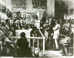 On December 2, 1859, abolitionist and Torrington native John Brown was hanged for treason after leading a raid on a federal armory at Harpers Ferry. John Brown was a radical abolitionist who believed in the violent overthrow of the slavery system. During the Bleeding Kansas conflicts, Brown and his sons led attacks on pro-slavery residents. Justifying his actions as the will of God, Brown soon became a hero in the eyes of Northern extremists and was quick to capitalize on his growing reputation. By early 1858, he had succeeded in enlisting a small “army” of insurrectionists whose mission was to foment rebellion among the slaves. In 1859, Brown and 21 of his followers attacked and occupied the federal arsenal at Harpers Ferry. Their goal was to capture supplies and use them to arm a slave rebellion. Brown was captured during the raid and later hanged, but not before becoming an anti-slavery icon.