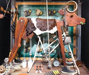 Working with old machine parts, kitchen utensils, furniture scraps, lighting fixtures, medical supplies, toys, and carnival figurines, Gerberich mixes the aesthetics of contemporary sculpture with the scientific principles of simple mechanical motion. It’s crazy fun!