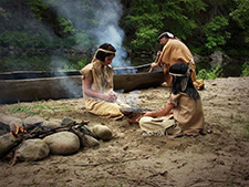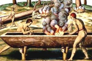 Making a dugout canoe is a mammoth undertaking and began with taking down a massive tree that was usually located near a river or lake. To fell a tree for a dugout canoe, Native Americans coated the base of a tree with mud and straw and built a fire that charred the trunk. As soon as the tree was down, the bark (that would be used to build wigwams) was removed and the ends of the trunk was cut and shaped into a point so that the canoe would move either direction. A small fire was started on top of the stripped tree trunk to burn out the top and bottom surface of the trunk. Stone hand tools would be used to scrape out and hollow the log and flatten the bottom of the canoe. The final step was to coat the canoe in bear grease to waterproof the wood.