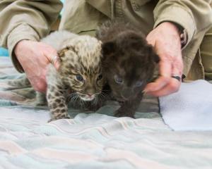 The female cub has melanism, an extremely rare black color variant in big cats. Melanistic cats have a condition where the body produces an excess of black pigment, the opposite of albinism. There are nine leopard subspecies, ranging from Africa all the way to the Amur leopard in eastern Russia. And while 11 percent of leopards alive today are thought to be melanistic, most are found in Southeast Asia, where tropical forests offer an abundance of shade. An extremely rare melanistic leopard was recently sighted in Africa for the first time in a century. There is currently one other melanistic Amur leopard in this country at the San Diego Zoo.