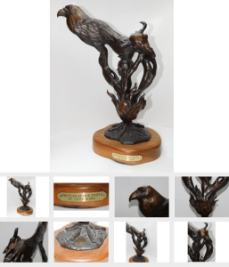 If you are in the market for a truly stunning sculpture, don’t miss the chance to bid on the piece called “Strength of our People” by Sisseton-Wahpeton Sioux artist, Janice Albro of South Dakota. The sculpture is signed and numbered 3 out of 20 pieces that date to 1993. This spectacular bronze depicts a fire with smoke rising up, forming into the image of the head of a person holding a pipe that transforms into a skull and finally into a crow. The crow symbol signifies wisdom, some Native American tribes believe that the crow has the power to talk and is considered the smartest bird. The crow is also the sacred bird of the Ghost Dance.