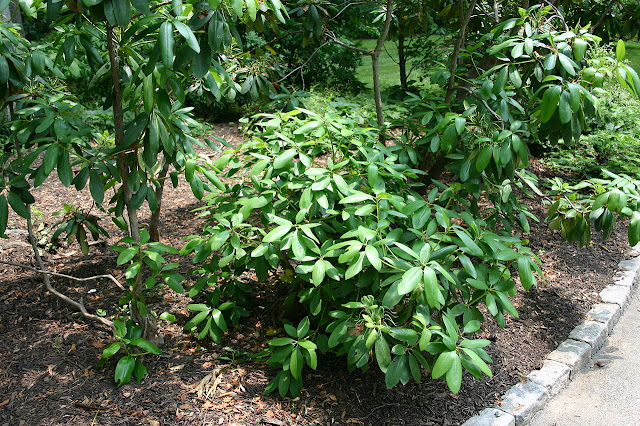 The Great Laurel, part of the Ericaceae (Heath) family, is a loose, broadleaf evergreen with a distinctive look: