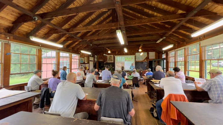 Yale Camp offers rustic lodging, quiet woodland trails, and shared gathering spaces with meals provided by Chef Stawitz of GMF catering.